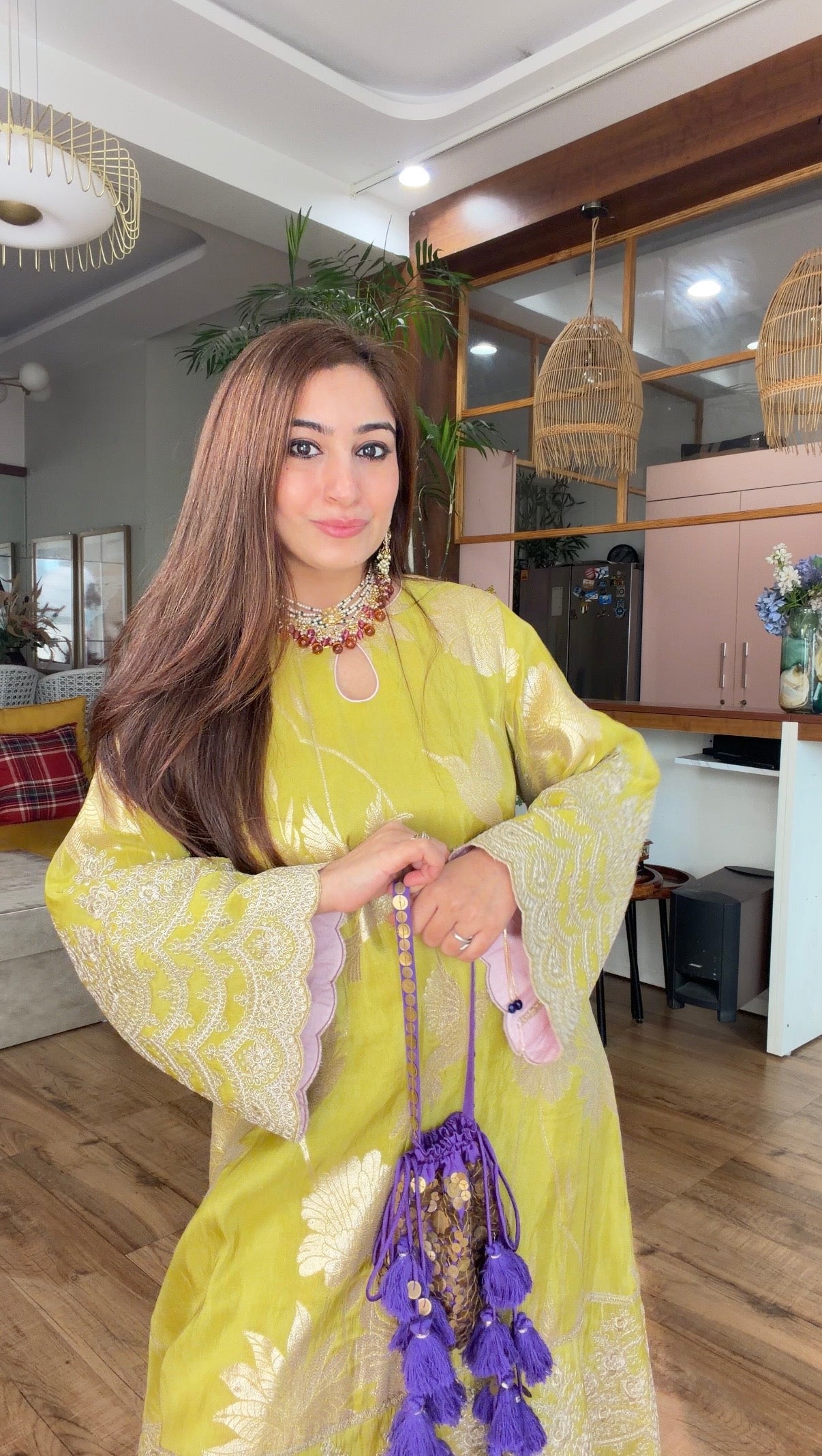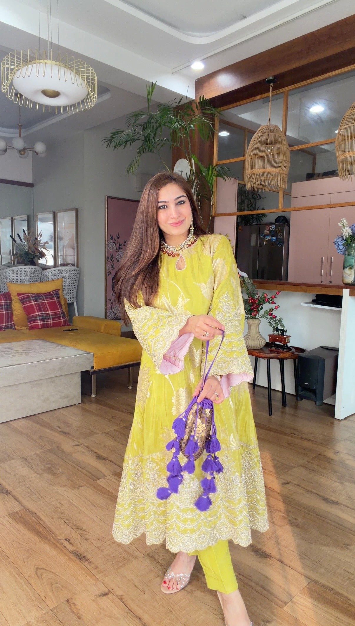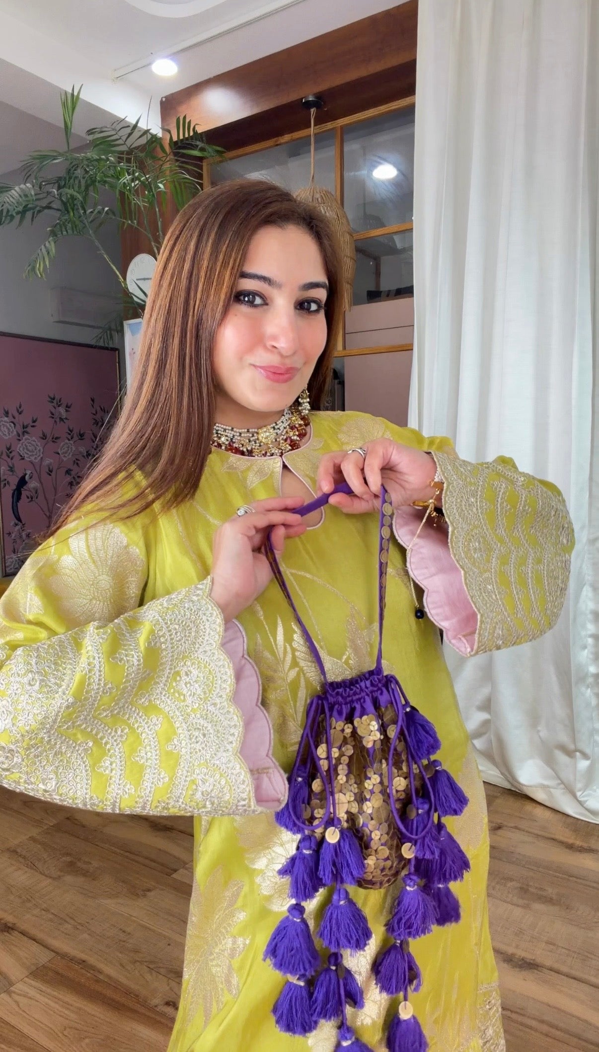 Pair it with a contrasting purple potli featuring coin work, available separately from our accessories bags collection, to complete the look with a playful pop of colour.