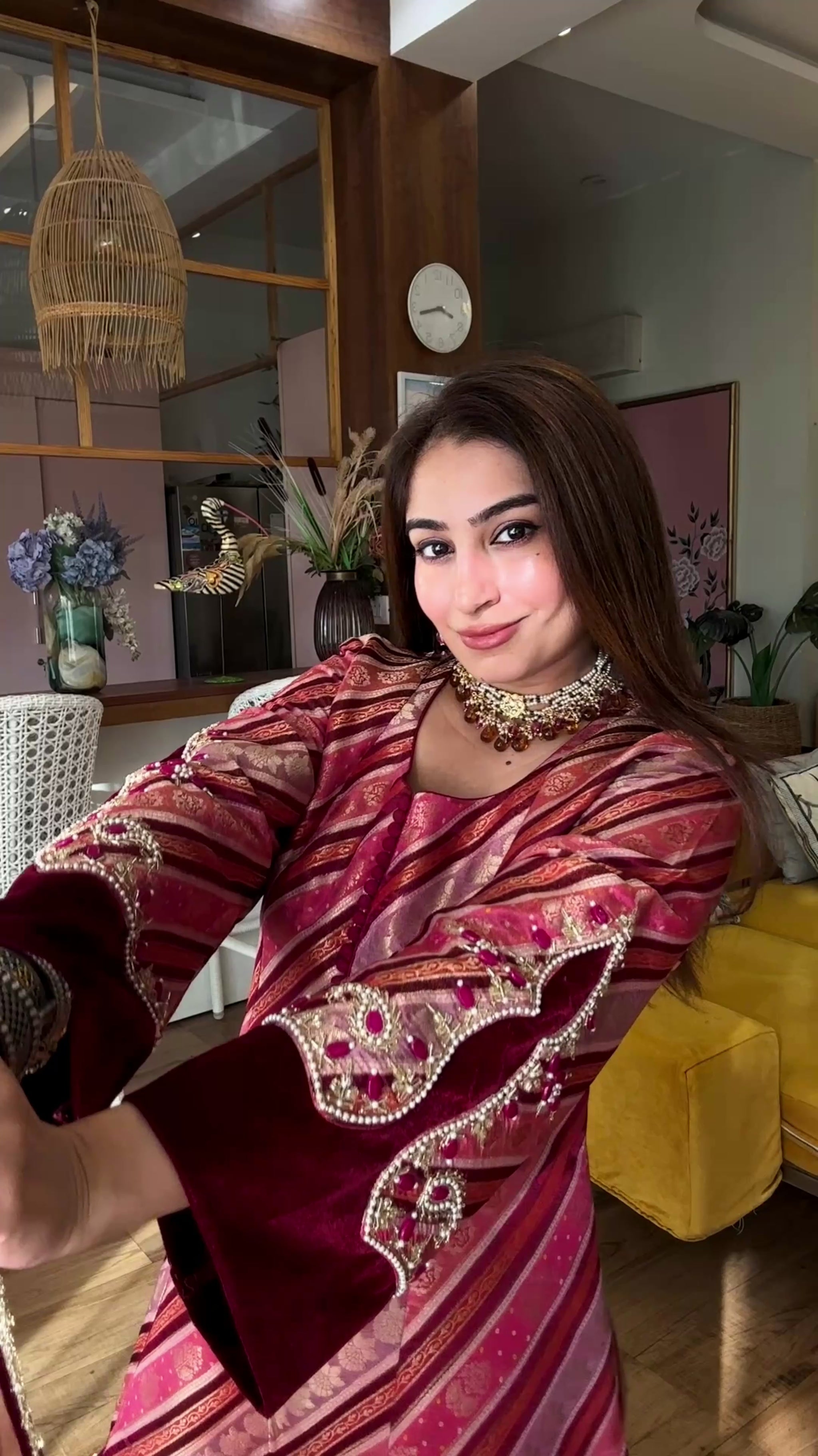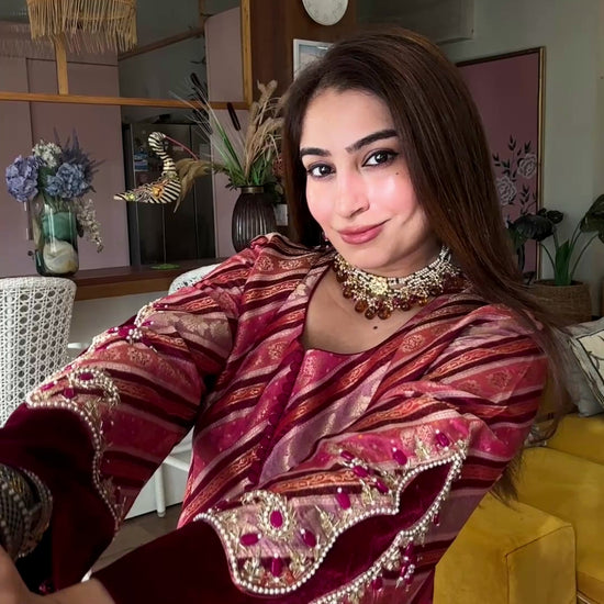 This 3 piece set features pure banarasi brocade silk kurta detailed with hand embroidery work with velvet finishing on sleeves, comes with gota work detailing on pure chanderi silk bottom highlighted with pure organza dupatta with velvet finishing.