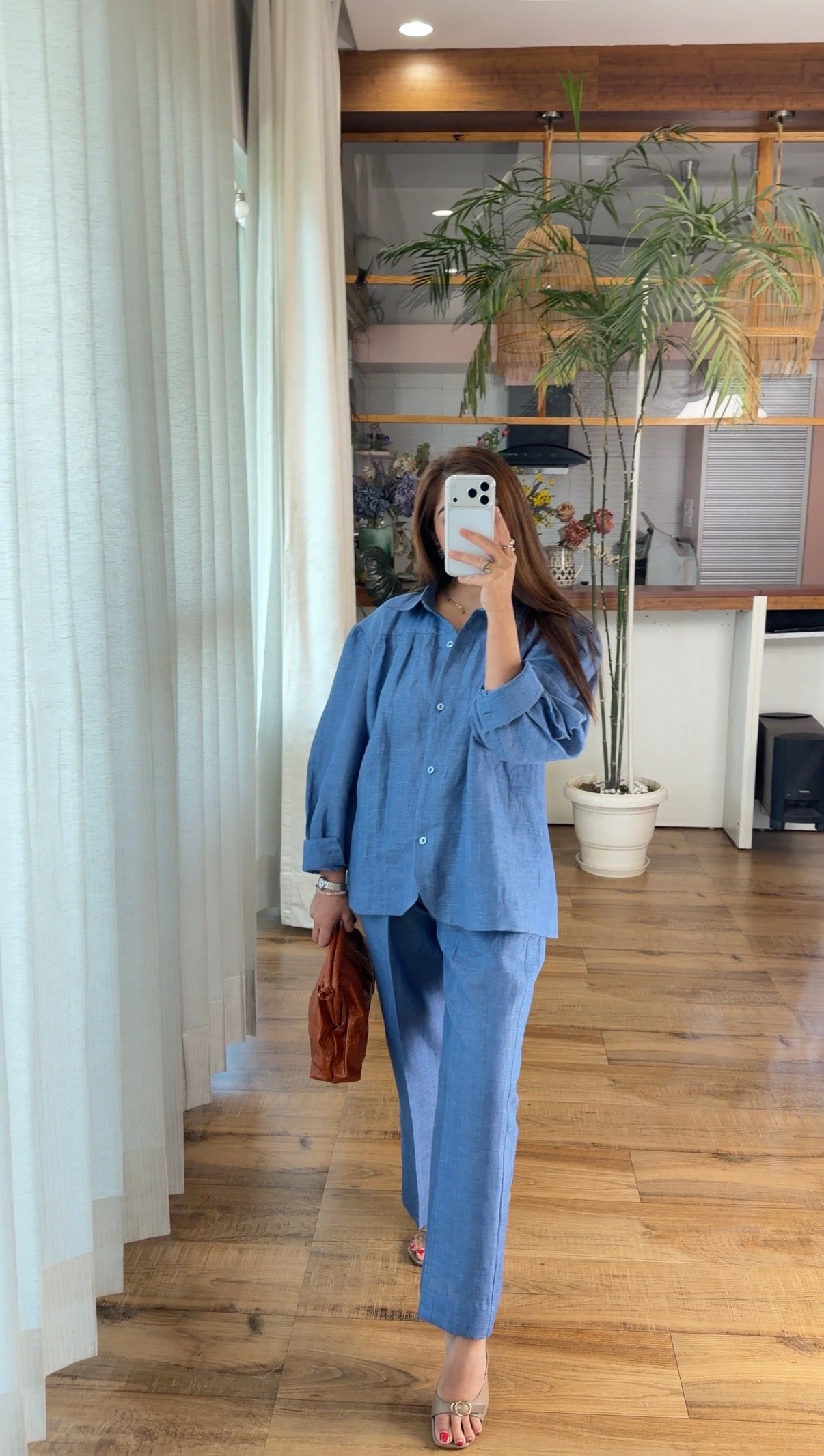 An easygoing cloud-slate linen co-ord set featuring a softly structured shirt with gentle gathers at the shoulders and relaxed sleeves, paired with straight-cut trousers for a laid-back yet put-together look. Lightweight and airy, it is perfect for long workdays, travel, or off-duty plans when you want all-day comfort without compromising on style.