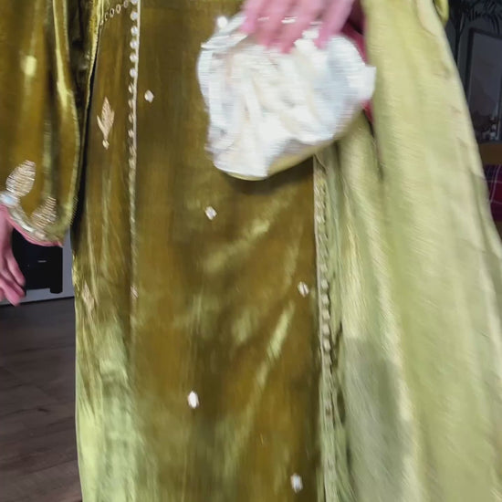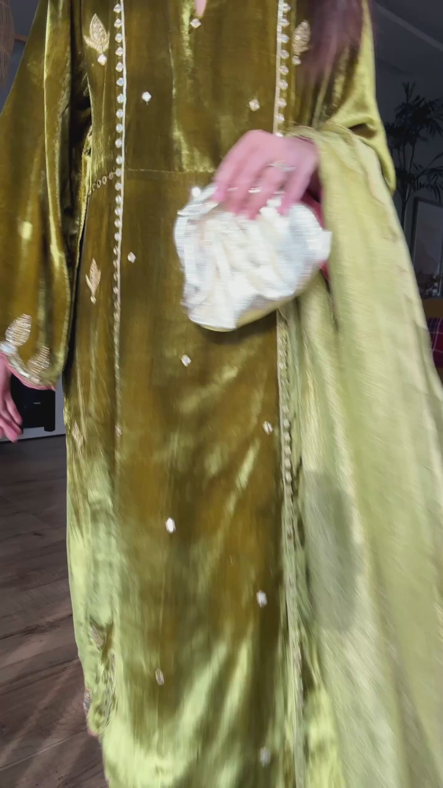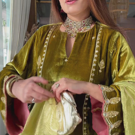 This 3 piece set features hand embroidered antique gold tone dabka and moti work with mirror on bottom and kurta yoke and sleeves with contrast resham scalloping on silk velvet in A line silhouette paired with hand embroidered flared velvet pants. Comes with pure tissue silk dupatta.